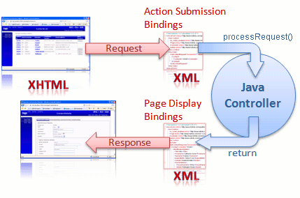 WebMaker provides the ability to bind the data within a web page in two directions. When information is submitted from the browser, an arbitrary XML document structure can be populated with the information contained within the submitted XHTML form. When a page is sent to the browser, another arbitrary XML document structure on the server can be used to bind XML fields to HTML fields on the web page. This bi-directional binding can be performed graphically within the WebMaker Page Design - Bindings tabs. Controllers on the server handle the requests and also compose the response structures that are then transformed by WebMaker to produce the HTML response to the Browser.