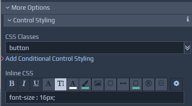 Styling options for individual controls, groups, labels, etc. can be found on the right hand side properties panel. Within the More Options, Styling section you will find styling properties, including a range of buttons that can be used to style your control.