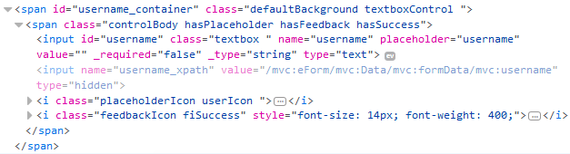 See below for details on how to extend this list of icons.By default, the placeholder icon is placed on the left, but you can also choose to place this on the right. If the icon appears on the right then an additional class placeholderRight will be present within the control markup.hasFeedback, FeedbackIconWebMaker controls now indicate the outcome of certain operations via a feedback mechanism. For example, server errors and validation errors raise CSS classes hasError and hasSuccess depending on the outcome. These classes are supplemented by 'feeback icon' classes fiError and fiSuccess that provide styling information for the appropriate icons or other attributes to visually portray the outcome of certain operations.