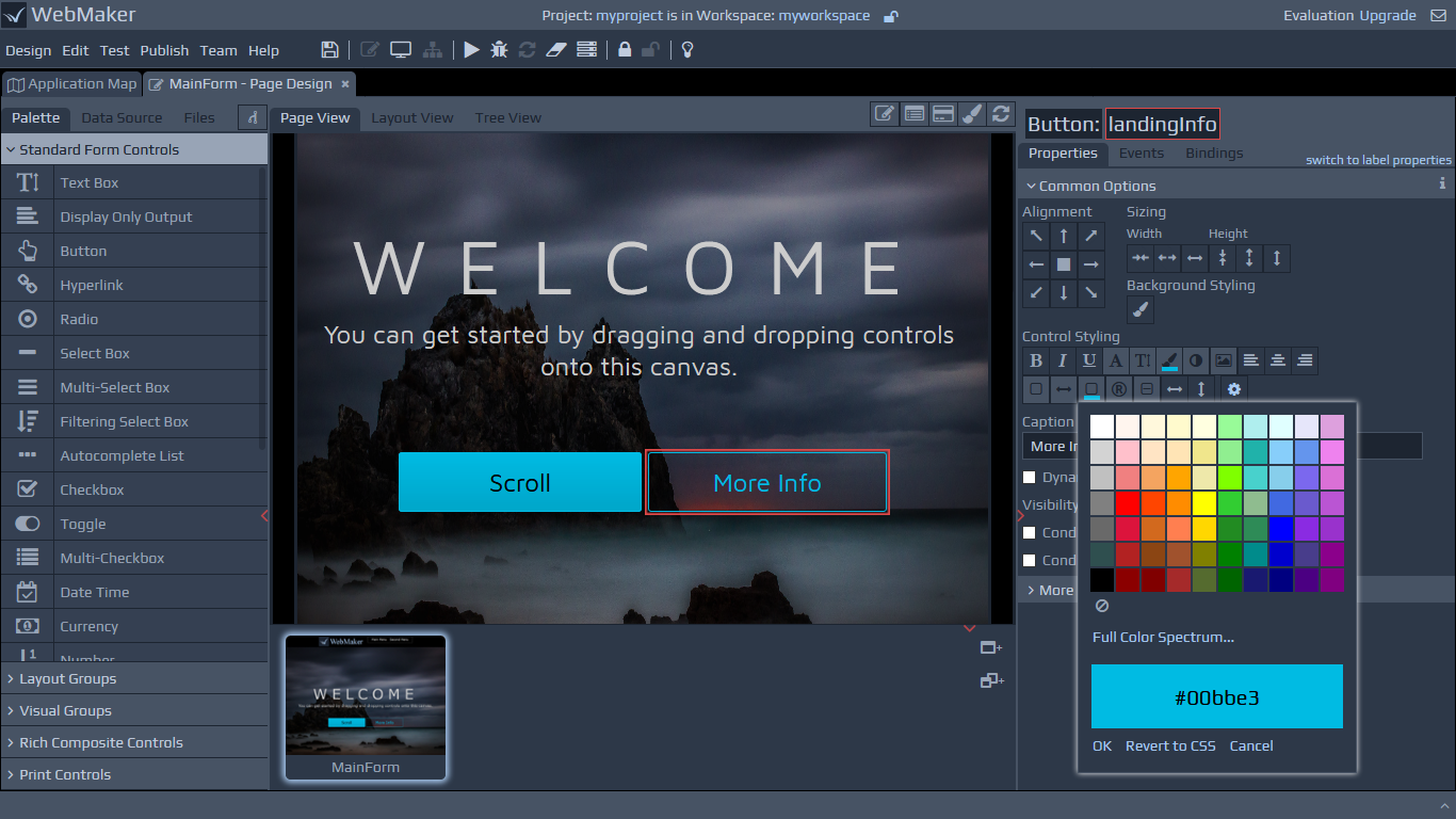 WebMaker pages use themes in the form of CSS files. You can locate these files within the Files tab on the left hand panel. You can change themes and also amend the CSS files to suit your exact requirements. Please see later sections on Themes - SASS and CSS Styling for more details.The right hand side properties panel is composed of two sections, the Common Options and More Options. Within the Common Options section you will find frequently used properties, including a range of buttons that can be used to style your control.The exact options available will depend on the selected control. As you use these buttons to change colours, fonts, etc., WebMaker adds inline style and class attributes as required to override definitions in the CSS. The buttons are typically shown in one of three colours. If the button is the same as the background colour, it means the option is unselected. A light foreground colour, means the option is selected. A dim gray colour indicates that the style information being applied is present in the underlying CSS files.As you click the various styling buttons, WebMaker determines the appropriate styles to override or class definitions to include for the control. You can fine-tune these settings by opening the More Options section and observing the changes being applied to the various CSS Overrides and Class Names fields.You can manually change these to suit your exact requirements. Ultimately, you can change the underlying CSS if you need total control over the look-and-feel of your application. The best approach for this is to alter the SASS files, if present, and compile these to CSS using a suitable SASS compiler. You can use the Theme Visualiser template to visualise your SASS/CSS changes.
